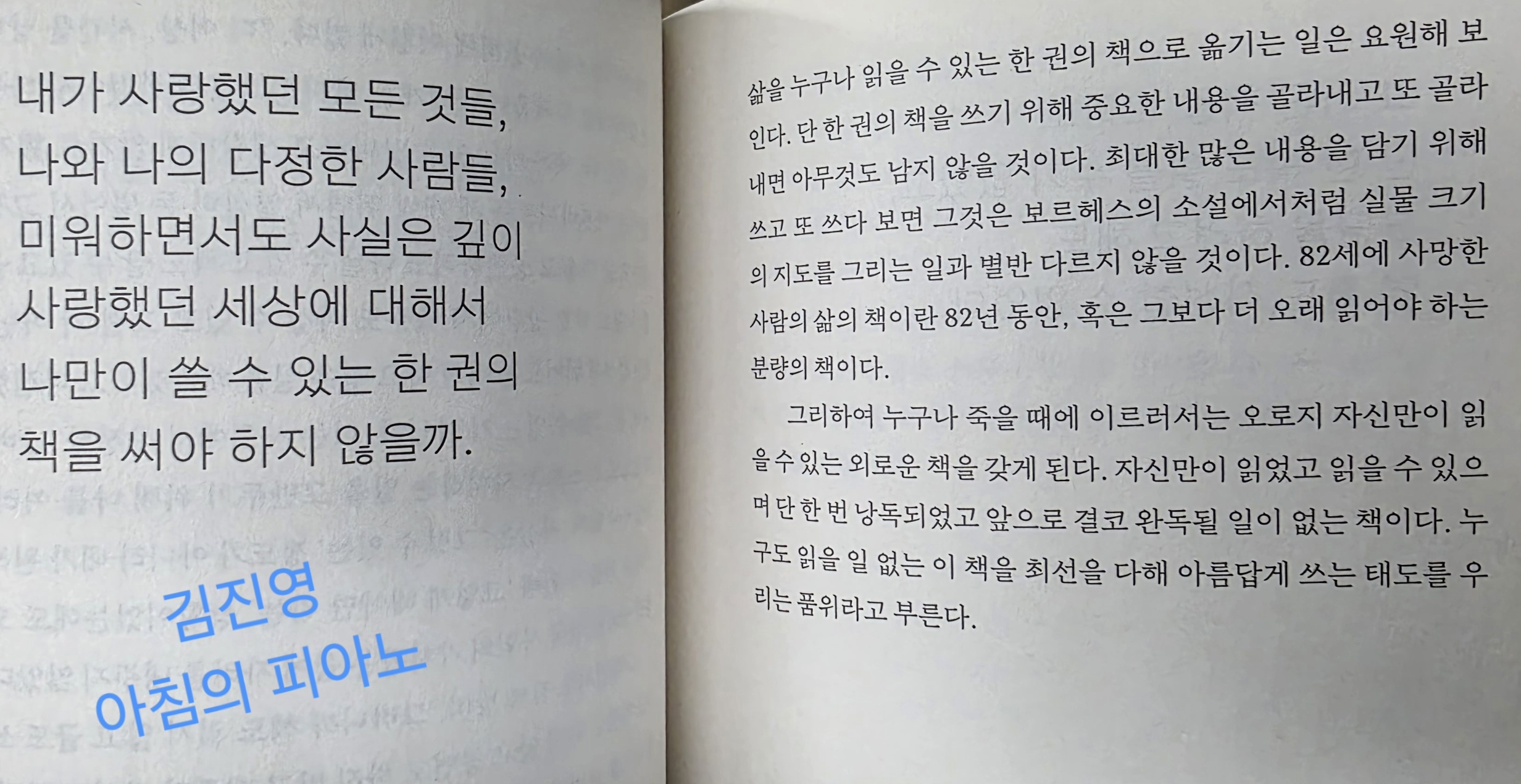작가가 읽은 책들에서 100마디를 뽑아서 그 한 마디에 얽힌 생각들을 풀어내는 에세이다. 신변잡기 이야기라서 커뮤니티 게시판에 올라온 글처럼 편한 글도 있고, 뭔가 잘 읽히지 않는 어려운 내용도 있다. 내가 못읽어본 책들이 대부분이지만, 유명한(듯한) 책들에서 인용한 짧은 글들이 왼쪽 페이지에 나오고, 그에 대한 작가의 (길어도 한페이지를 넘지 않는) 짧은 에세이가 오른쪽 페이지에 나온다. 그날 있었던 일을 거두절미하고 인스타에 올리거나 하면 그 글을 읽는 사람들은 전체 맥락은 모르겠고, 그냥 글의 분위기를 보고 느끼기 마련이다. 나도 필 받는 영화 한 장면, 글 한 줄에 블로그에 짧은 감상을 남기곤 하지만, '친절한 글쓰기'는 아니다 싶은 생각도 하고, 한 편으론 그런 글은 원래 그런 거라는 생각도 한다.